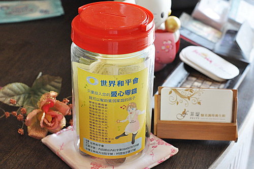 這個朋友本身很有愛心,都會捐錢給家扶基金,發現這個罐子,我以為她是義工,結果不是啦...她說只要跟社團法人世界和平會連繫,就可以申請這種愛心零錢罐,專門給一般店家或是公司行號,放置在明顯的入口處,或是結帳的櫃台,讓消費者可以投入一些小零錢,但是同時幫助到很多弱勢團體,像是:關懷認養貧童、支援受暴幼婦、輔導單親子女、協助孤苦老人、輔導外配子女、協助身障朋友、助建貧困學校、輔導低收入戶、輔導犯罪少年、輔導中輟學生、推動急難救助、義務教授氣功、輔導隔代教養子女、輔導原住民兒童。