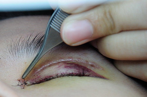拆線的流程很簡單,就先把縫在切開處的部份,用剪刀剪斷,然後用夾子夾住打結的頭拉出,結束。拉的時候不痛,只有一些刺刺感覺,拆眼頭的比較痛一點點,可能眼頭比較薄吧?不過這種刺痛是連我都可以承受的,應該大家都能接受吧(笑)